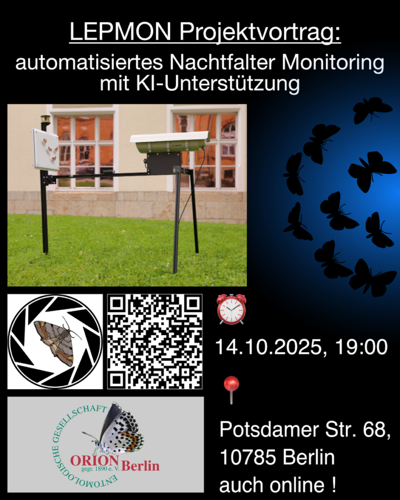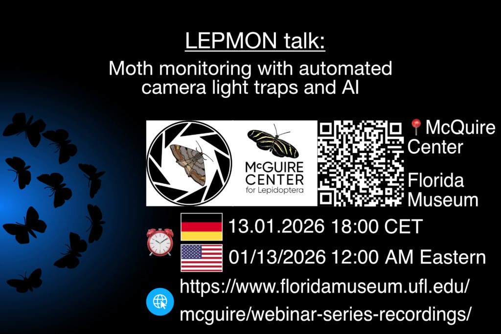 Unser LEPMON- Projekt startet in das Neue Jahr mit einem Vortrag beim McGuire Center for Lepidoptera & Biodiversity (https://www.floridamuseum.ufl.edu/mcguire/webinar-series-recordings/). Dieser Vortrag findet nächste Woche Dienstag, 13.01.2026 um 18:00 (CET) online via Zoom statt. Vortragssprache wird Englisch sein, um dem amerikanischen Publikum und den Studenten der Universität in Florida zugänglich zu sein. Ich lade euch aber auch herzlich ein, an dem Vortrag teilzunehmen. Das ist insbesondere für alle eine gute Gelegenheit, die zum Vortrag in Berlin bzw. Karlsruhe verhindert waren, aber trotzdem den Vortrag sehen wollten.