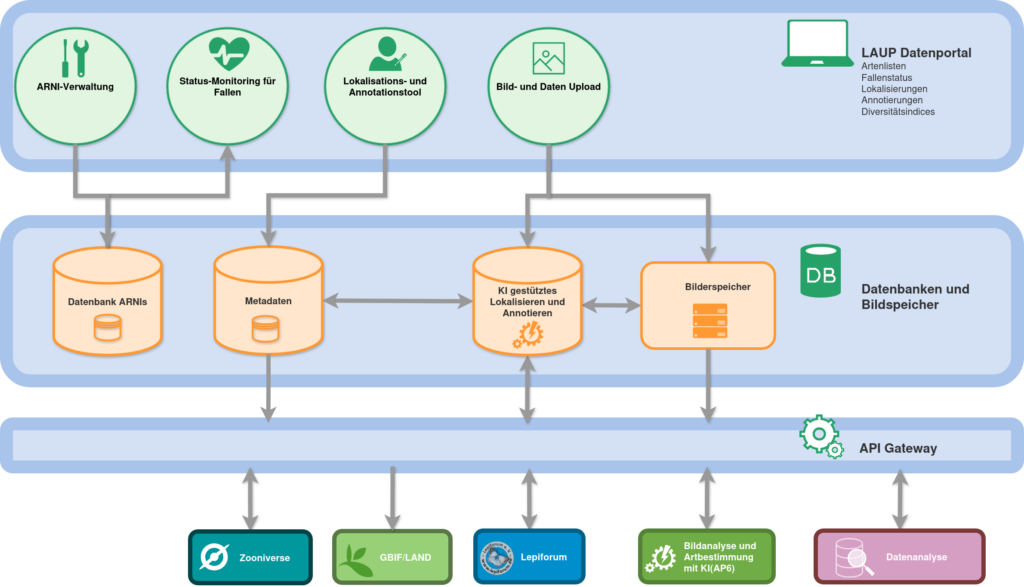 Im Lepmon-Projekt werden verschiedene Webtools zur Verfügung gestellt, die eine einfache Handhabung der Daten ermöglichen. Dazu gehören Werkzeuge zur Verwaltung und Überwachung der Fallen, die Möglichkeit, Bilder aus den Fallen hochzuladen, sowie ein KI-gestütztes System, das bei der Identifizierung und Lokalisation der Nachtfalter auf dem Bild unterstützt. Ein Datenportal sorgt dafür, dass die Ergebnisse übersichtlich dargestellt werden. Die dabei anfallenden Daten werden in mehreren Datenbanken organisiert und gespeichert. Über verschiedene Schnittstellen erfolgt ein Informationsaustausch mit anderen Datenportalen und Online-Diensten, sowohl innerhalb des Projekts als auch darüber hinaus.